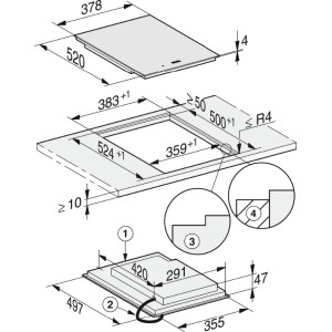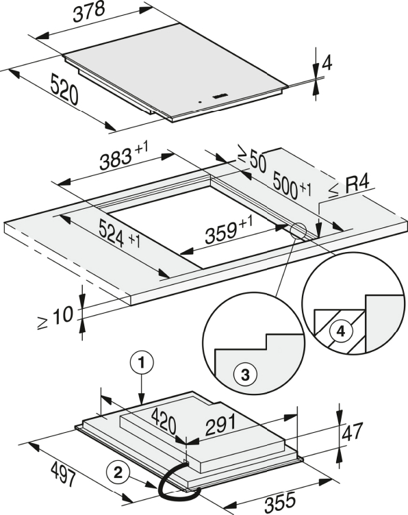 Zewnętrzne wymiary wycięcia w mm (głębokość) przy wpasowaniu w blat