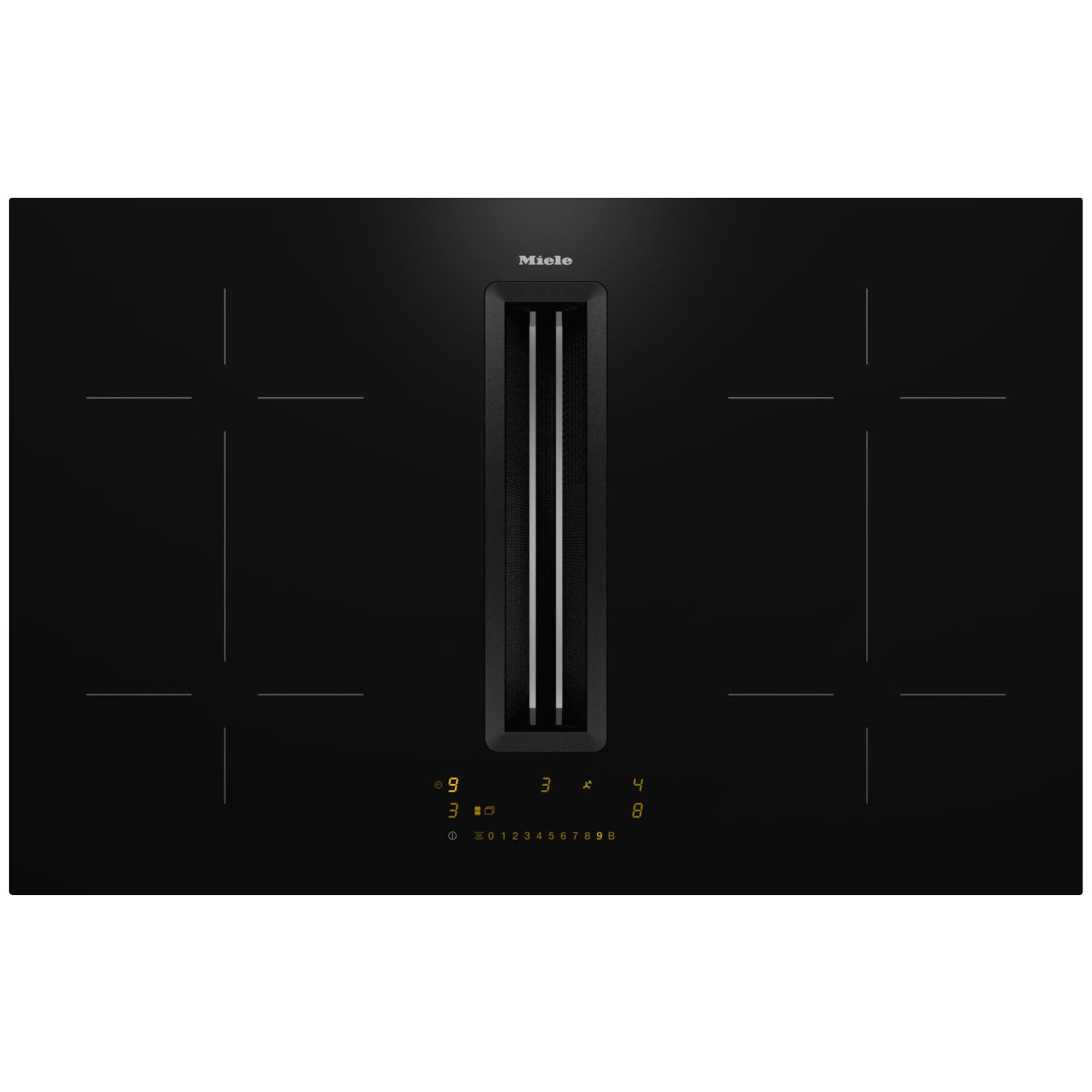 System Miele@home integruje urządzenie w sieć domową rozszerzając opcje sterowania. Funkcja Con@ctivity automatycznie synchronizuje pracę wyciągu z aktywnością płyty regulując wentylację. Obsługa odbywa się poprzez przyciski dotykowe ComfortSelect Plus z cyfrowymi wskazaniami poziomów mocy na żółtym wyświetlaczu. Płyta oferuje stałe rozpoznawanie naczynia oraz indywidualne możliwości ustawień. Dostępny jest wskaźnik zużycia filtra z węgla aktywnego.