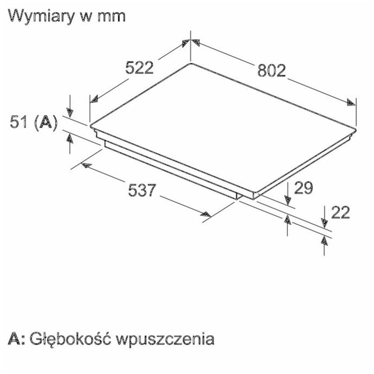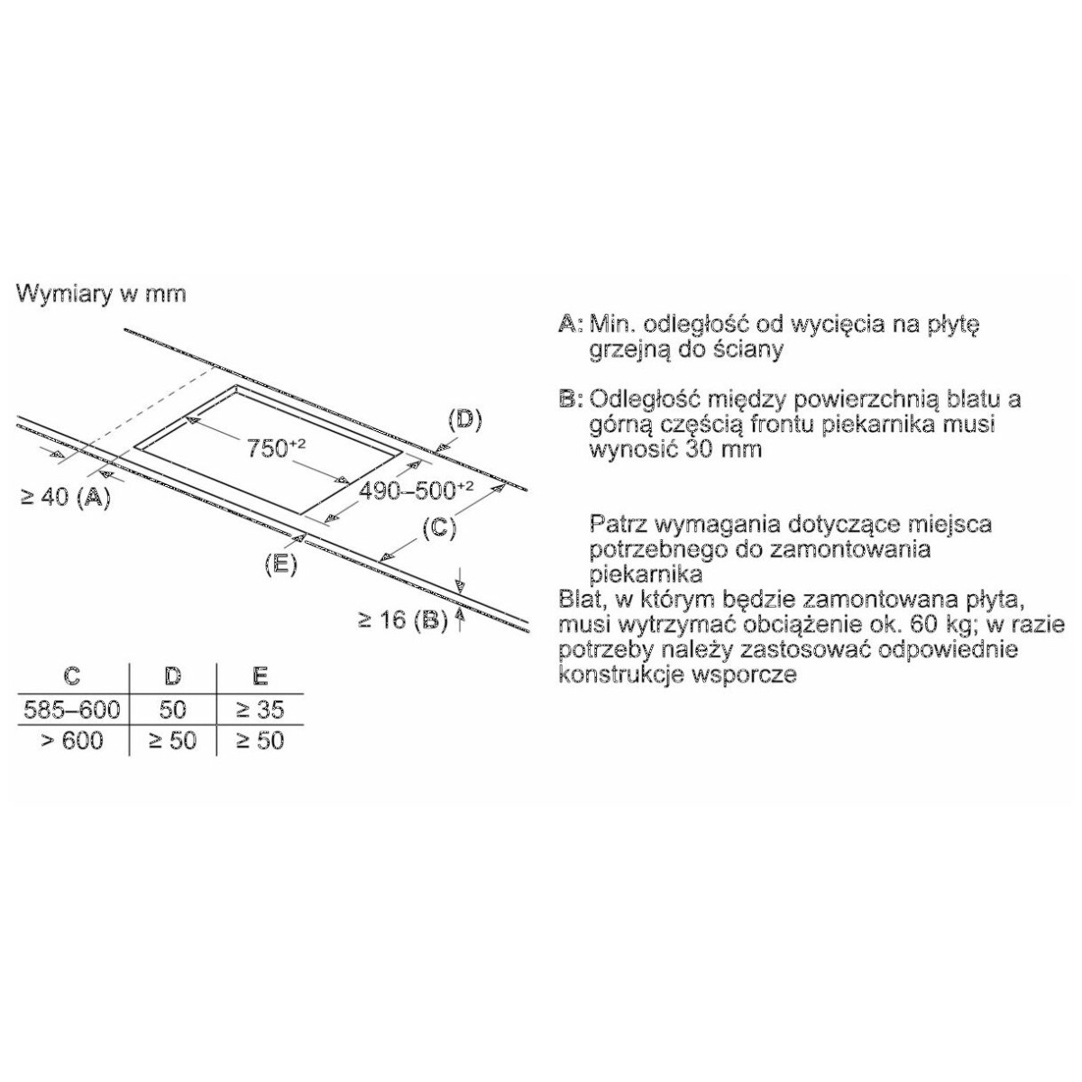 | Wymagane wymiary montażowe wnęki (WxSxG mm) | 51 x 750 x (490 – 500) |