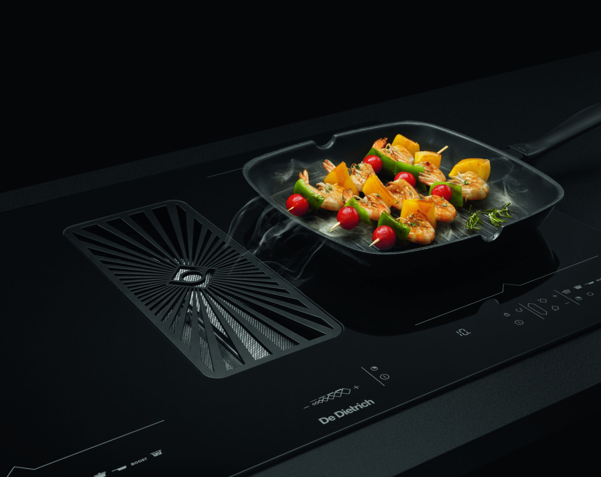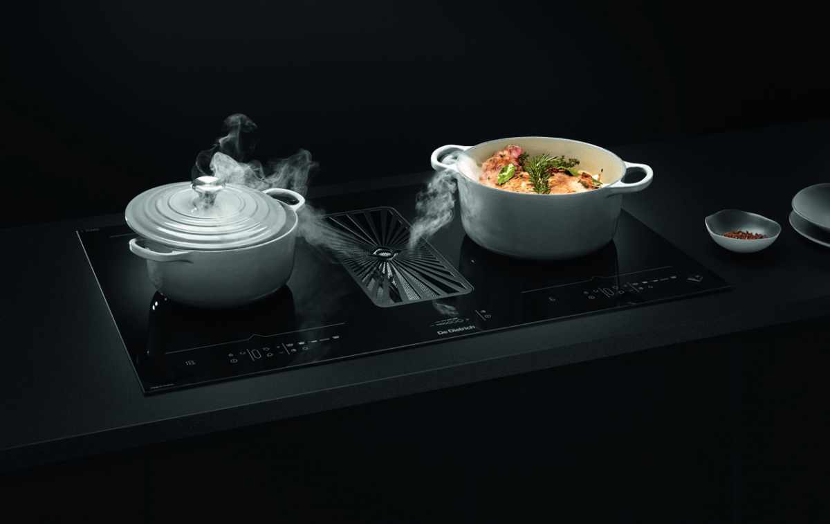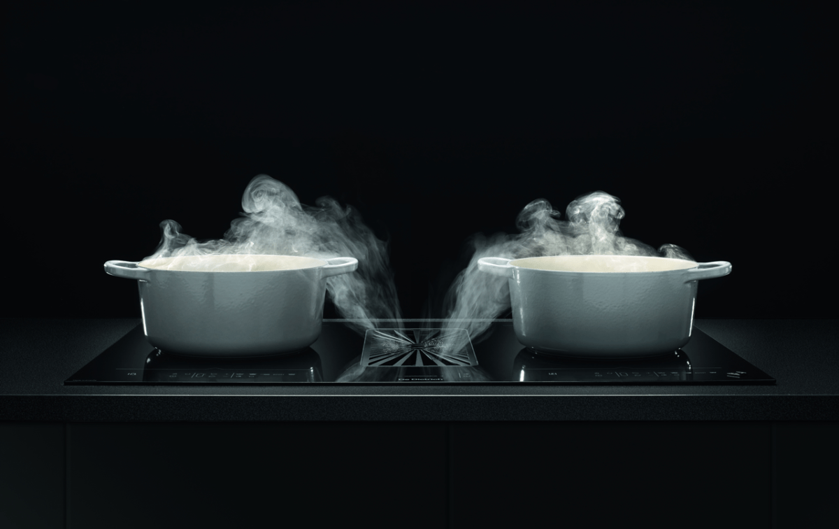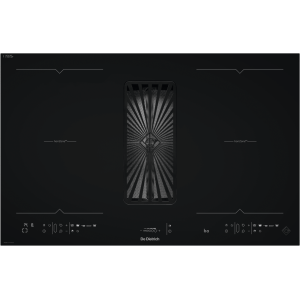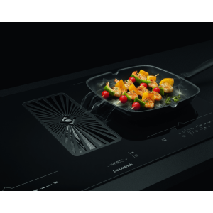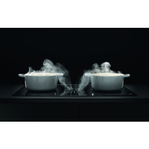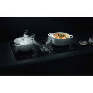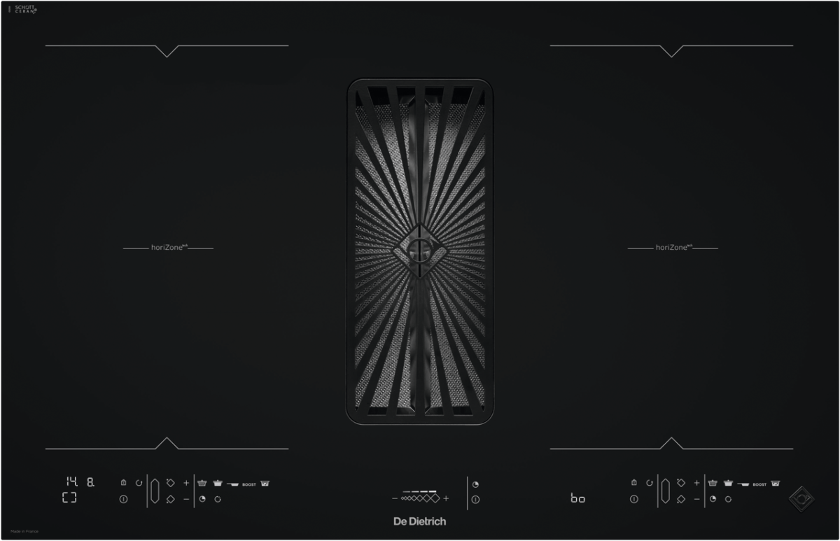 - Płyta indukcyjna o szerokości 80 cm z dwiema powierzchniami HoriZone i zintegrowanym okapem