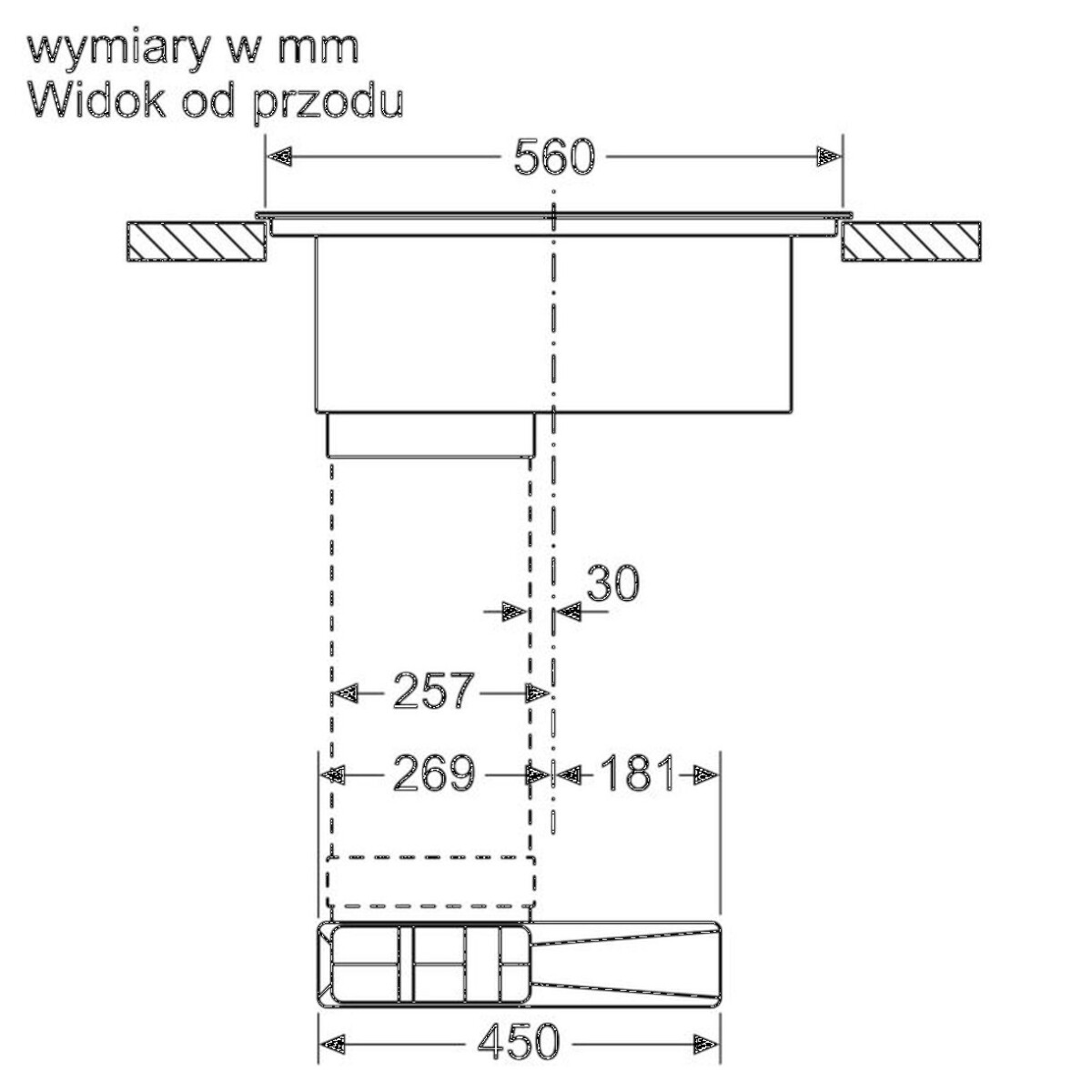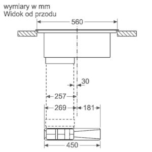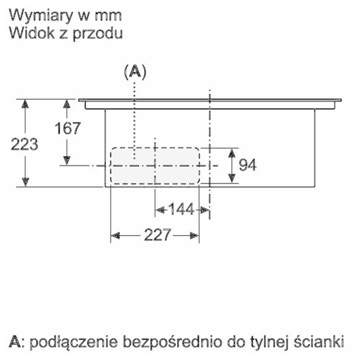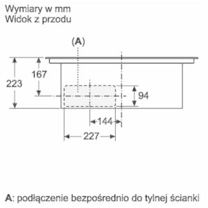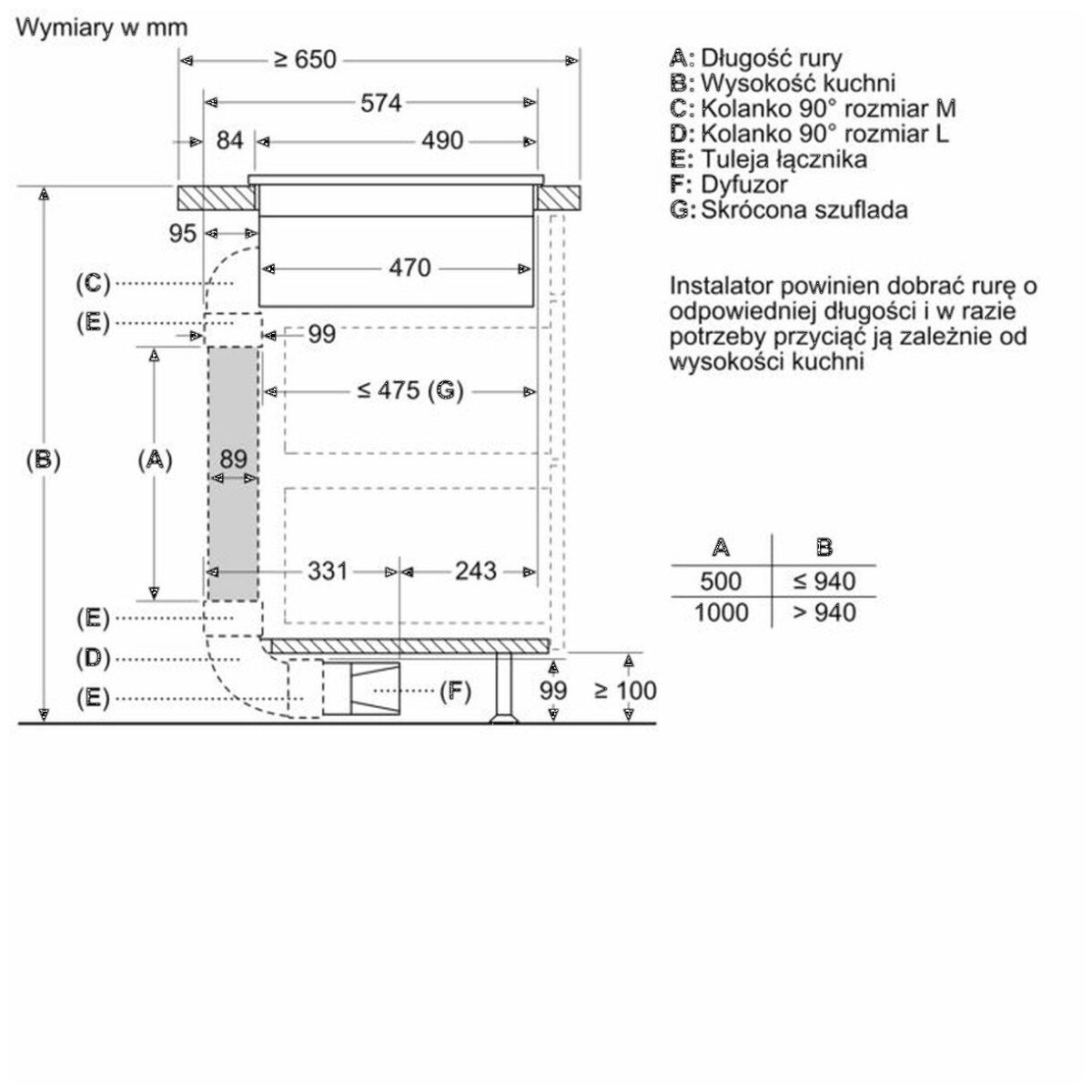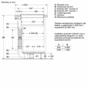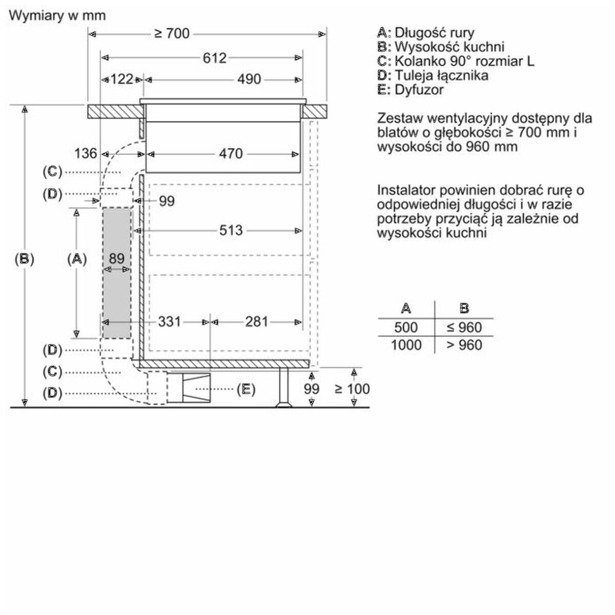 | Pod płytą kuchenną ze zintegrowanym systemem wentylacji nie jest wymagana przegroda. Szuflady i / lub półki pod urządzeniem muszą być wyjmowalne. Większa część tylnej ścianki szafki pozostaje zachowana – wystarczy tylko wycięcie na wylot powietrza. Jego położenie i rozmiar można pobrać z instrukcji montażu. | |