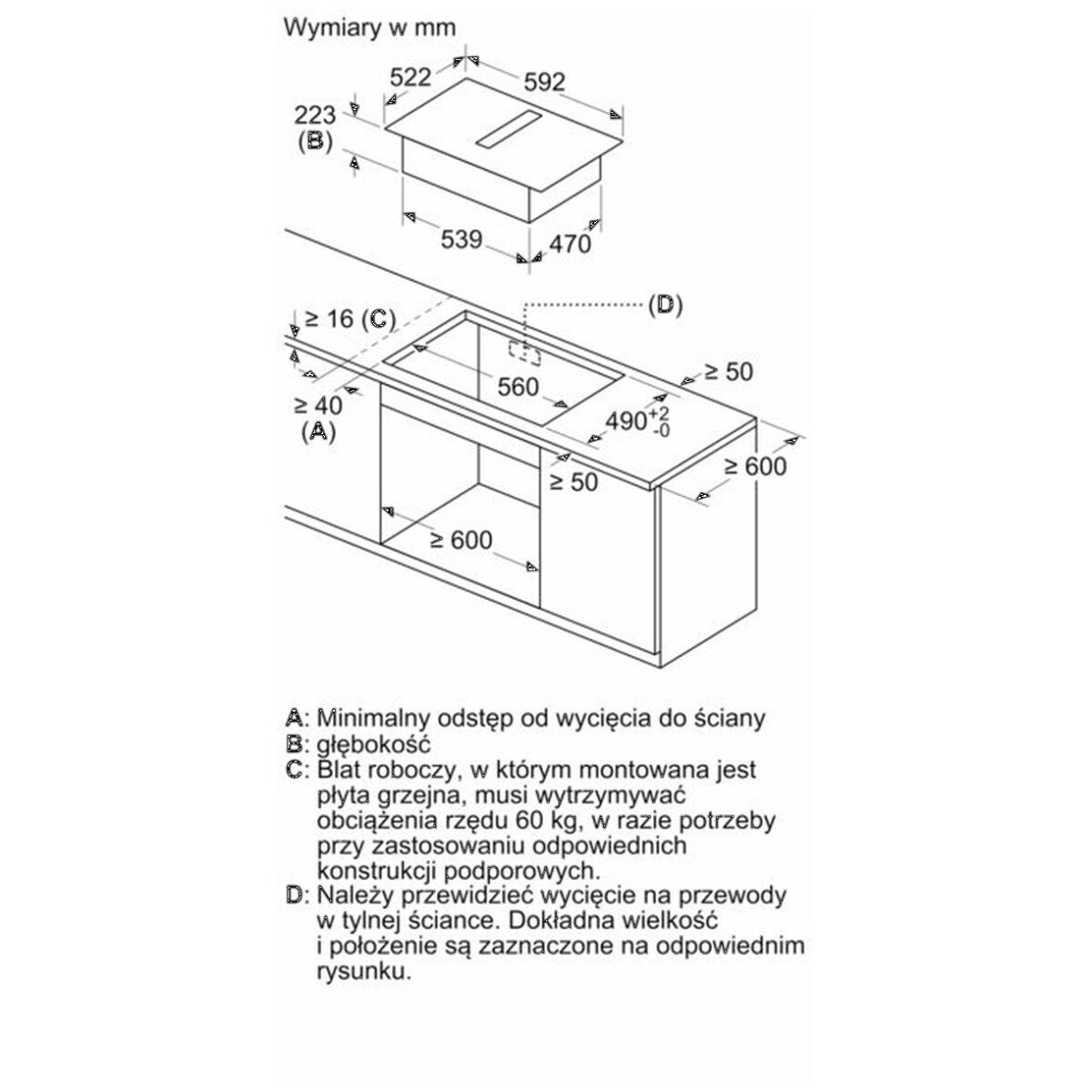 | Wymagane wymiary montażowe wnęki (WxSxG mm) | 223 x 560 x (490 – 490) |