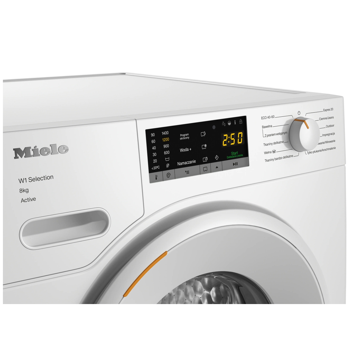 Obsługa to pokrętło wyboru z wyświetlaczem EasyControl żółty. AddLoad pozwala dodać pranie po starcie cyklu. Programowanie startu z opóźnieniem do 24 godzin i wskazanie czasu pozostałego.