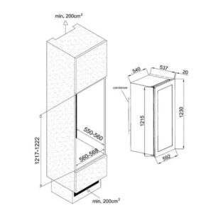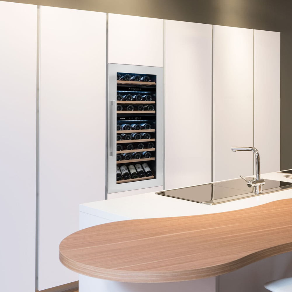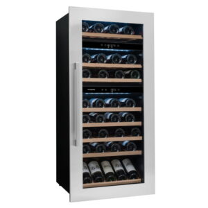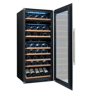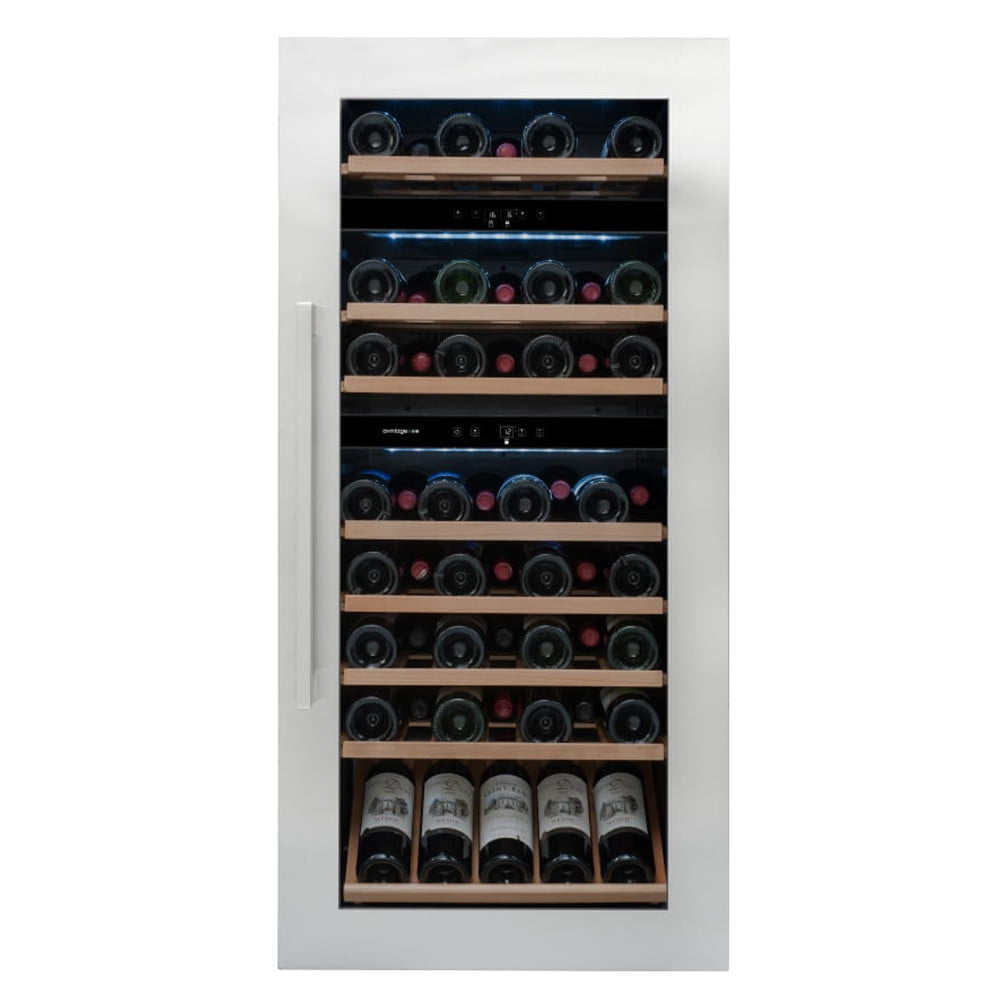 Winiarka AVI94X3Z do zabudowy w słupku. Trzystrefowa, o pojemności 71 butelek. Półka do prezentacji wina. Zastosowanie półki do prezentacji zmniejsza pojemność winiarki.