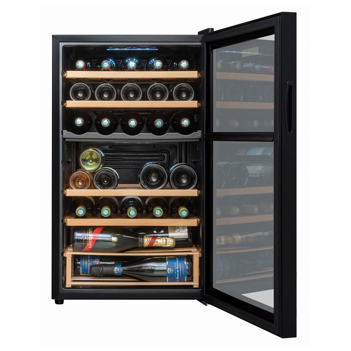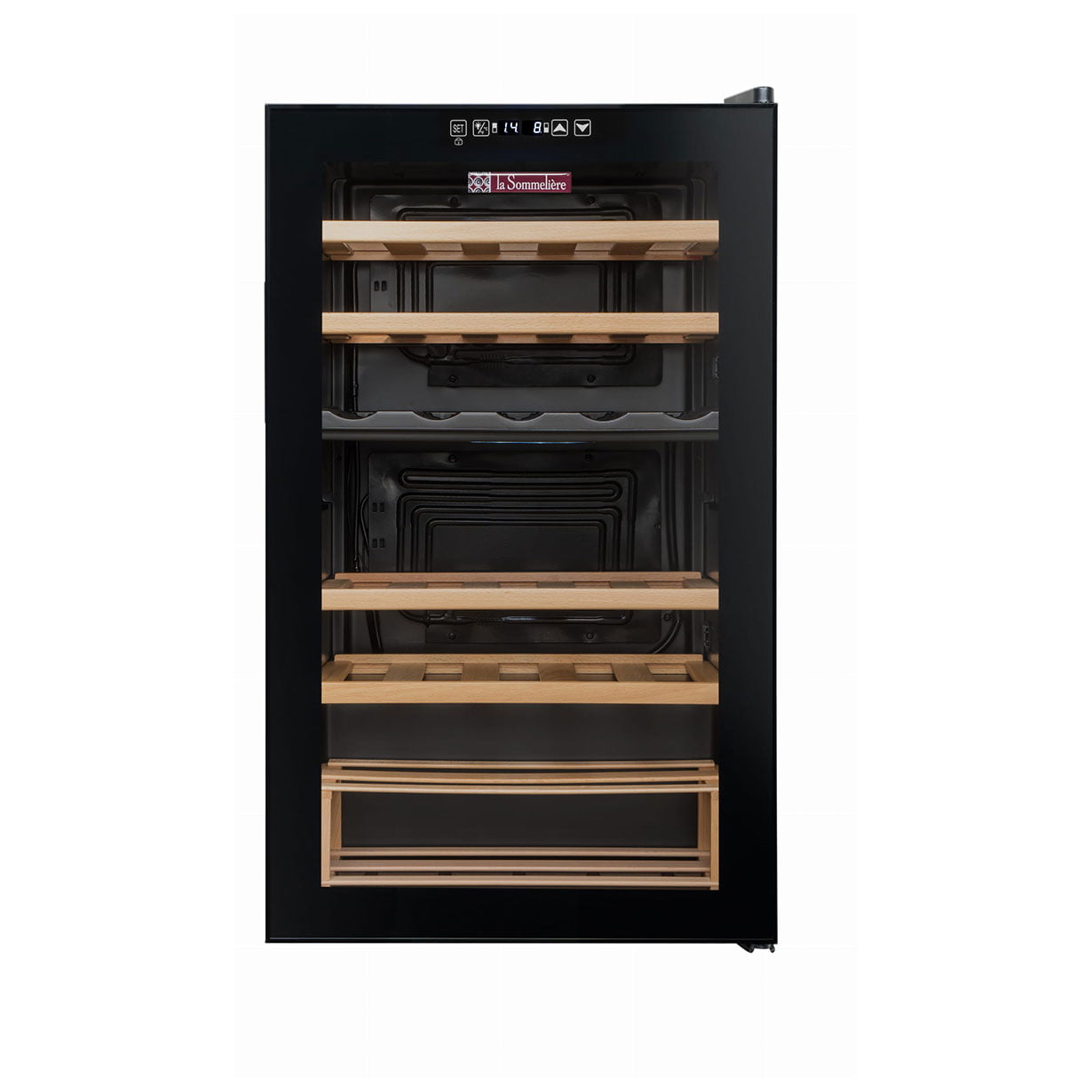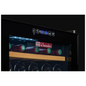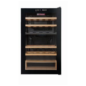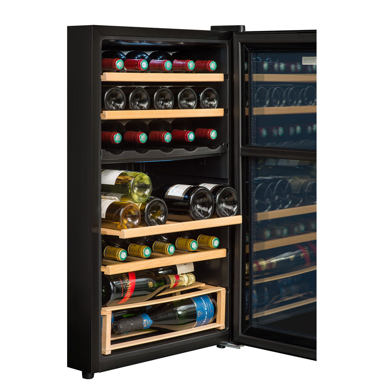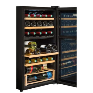 SLS33DZ dwustrefowa winiarka do serwowania i kontroli temperatury 33 butelek wina. Każda strefa może być regulowana niezależnie od drugiej. Dostarczana jest z 4 stałymi półkami z drewna bukowego i drewnianym stojakiem w dolnej części piwnicy.