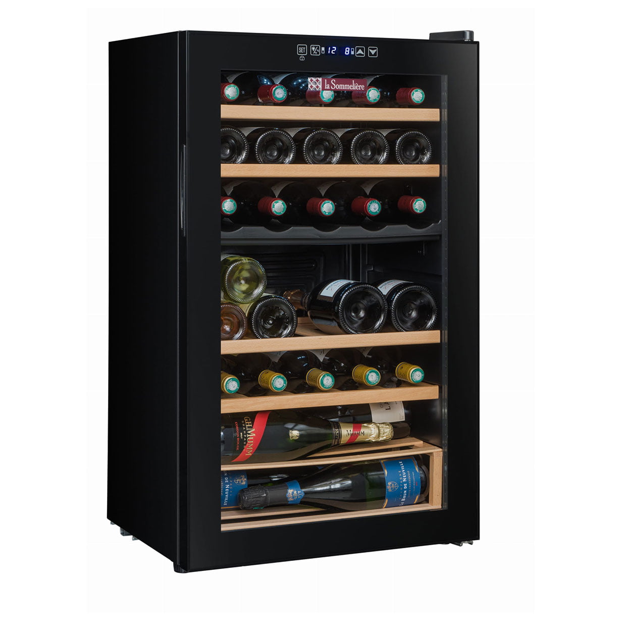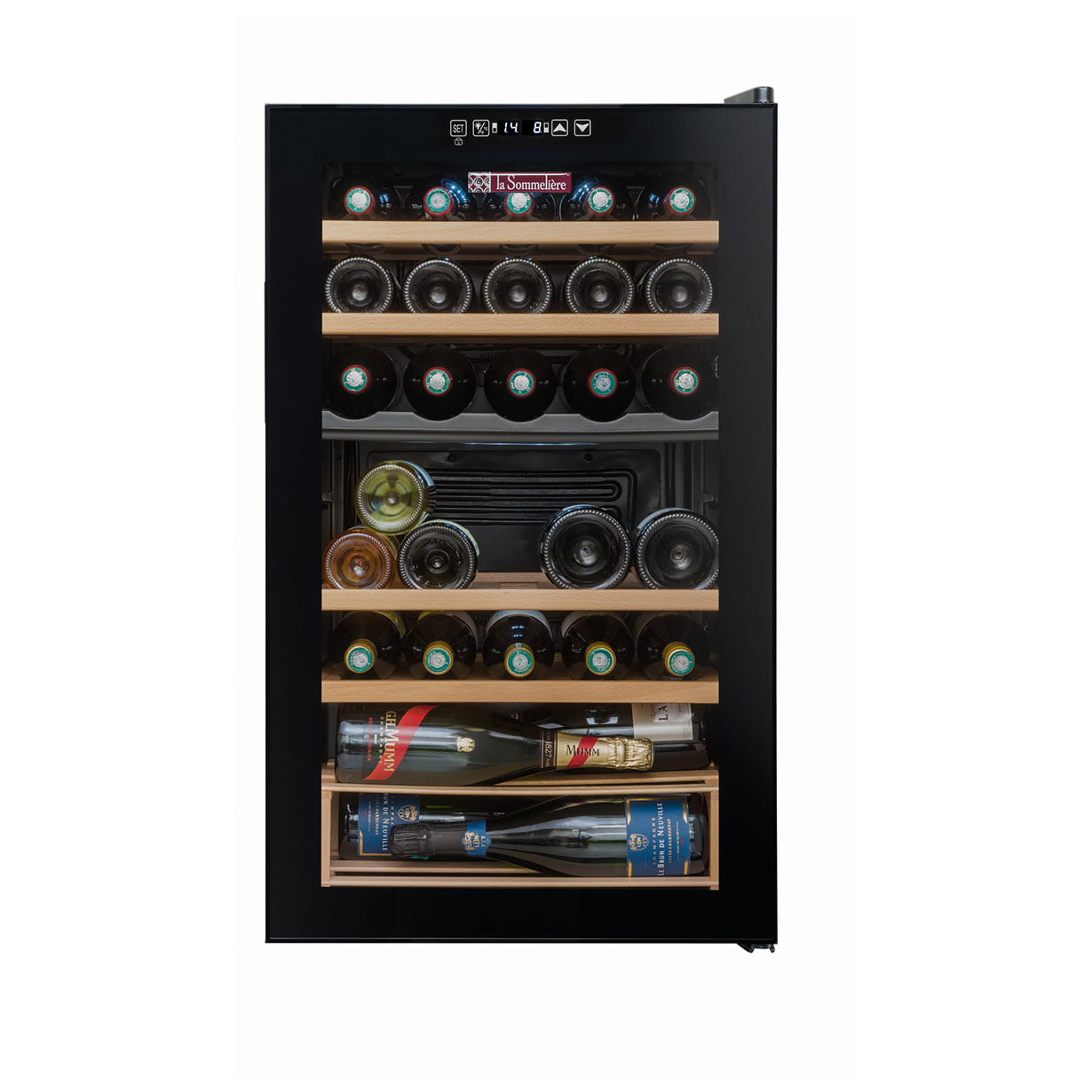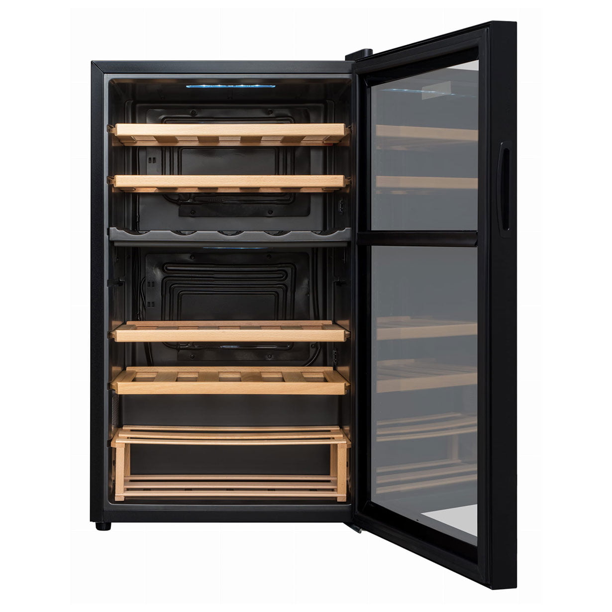 SLS33DZ dwustrefowa winiarka do serwowania i kontroli temperatury 33 butelek wina. Każda strefa może być regulowana niezależnie od drugiej. Dostarczana jest z 4 stałymi półkami z drewna bukowego i drewnianym stojakiem w dolnej części piwnicy.
