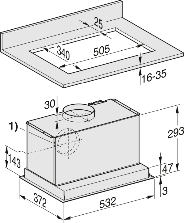 | Głębokość korpusu okapu w mm |
