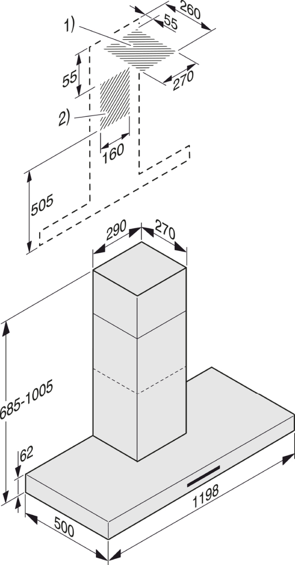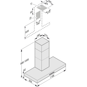| Całkowita wysokość okapu w obiegu otwartym i wersji Extern w mm |