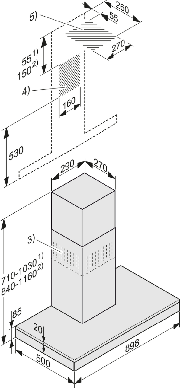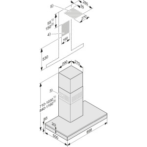 Całkowita wysokość okapu w obiegu zamkniętym w mm
