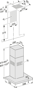 | Całkowita wysokość okapu w obiegu otwartym i wersji Extern w mm |