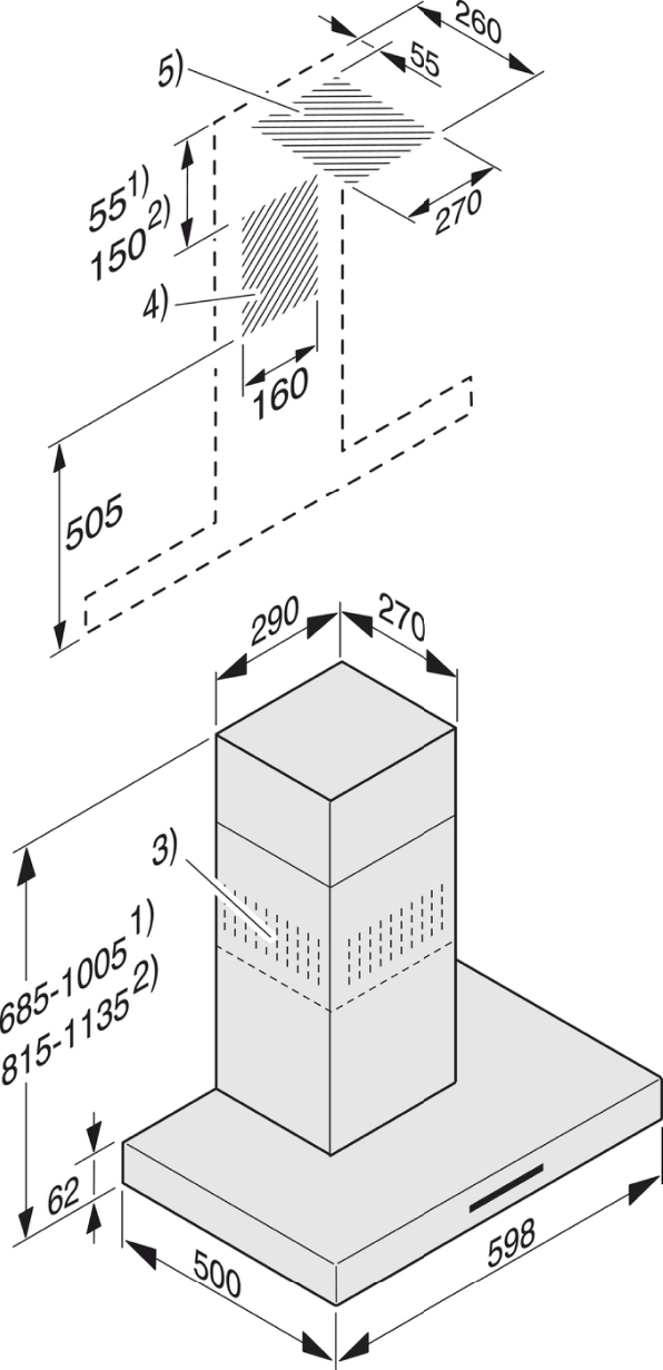 | Całkowita wysokość okapu w obiegu otwartym i wersji Extern w mm |