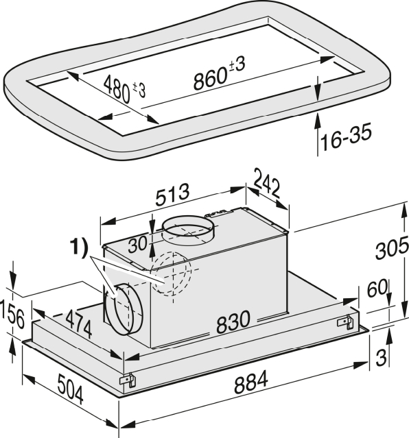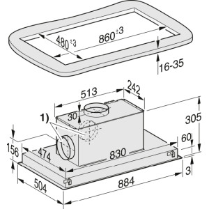 | Całkowita wysokość okapu w obiegu zamkniętym w mm |
