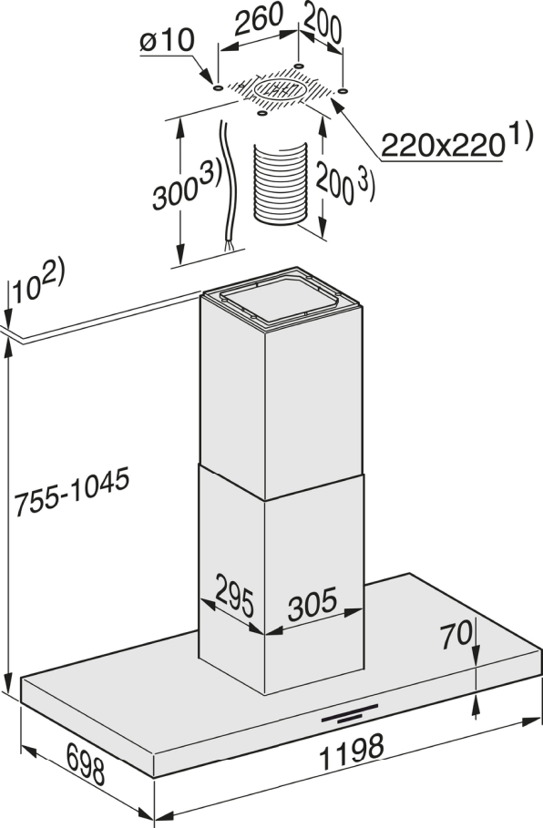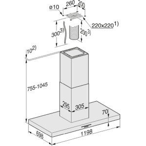 | Całkowita wysokość okapu w obiegu otwartym i wersji Extern w mm |