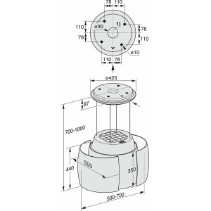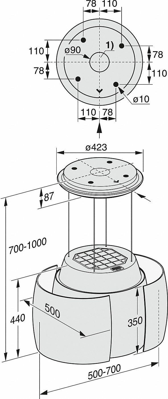 | Całkowita wysokość okapu w obiegu zamkniętym w mm |