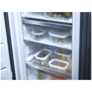 Konstrukcja przewiduje zabudowę zintegrowaną. Możliwość zmiany kierunku otwierania drzwi ułatwia dopasowanie do aranżacji. Funkcja SoftClose zapewnia delikatne domykanie. System NoFrost automatycznie odszrania wnętrze eliminując szron. VarioRoom elastycznie dostosowuje przestrzeń dzięki 8 wyjmowanym szufladom.