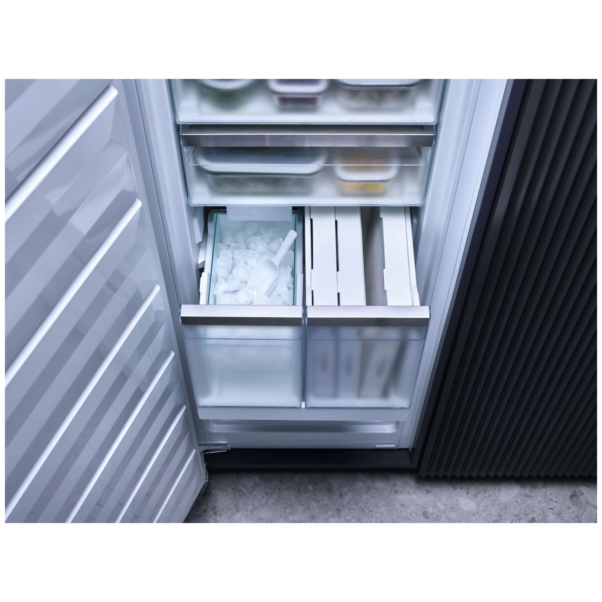 Zapewnia całkowitą pojemność użytkową 213 l rozmieszczoną w ośmiu szufladach na mrożonki z czego sześć umieszczono na wygodnych prowadnicach a dwie szuflady Ice&PizzaBox oferują specjalne miejsce na przechowywanie. Wbudowana kostkarka do lodu z podłączeniem świeżej wody gwarantuje stały dostęp do świeżych kostek produkując 0.8 kg lodu na dzień.