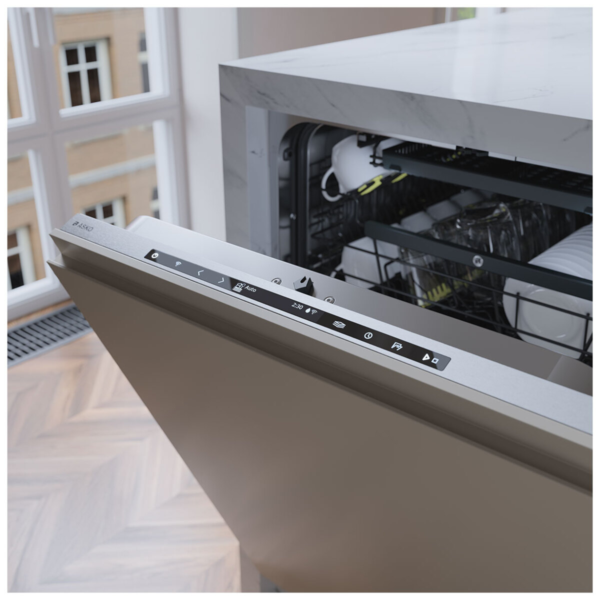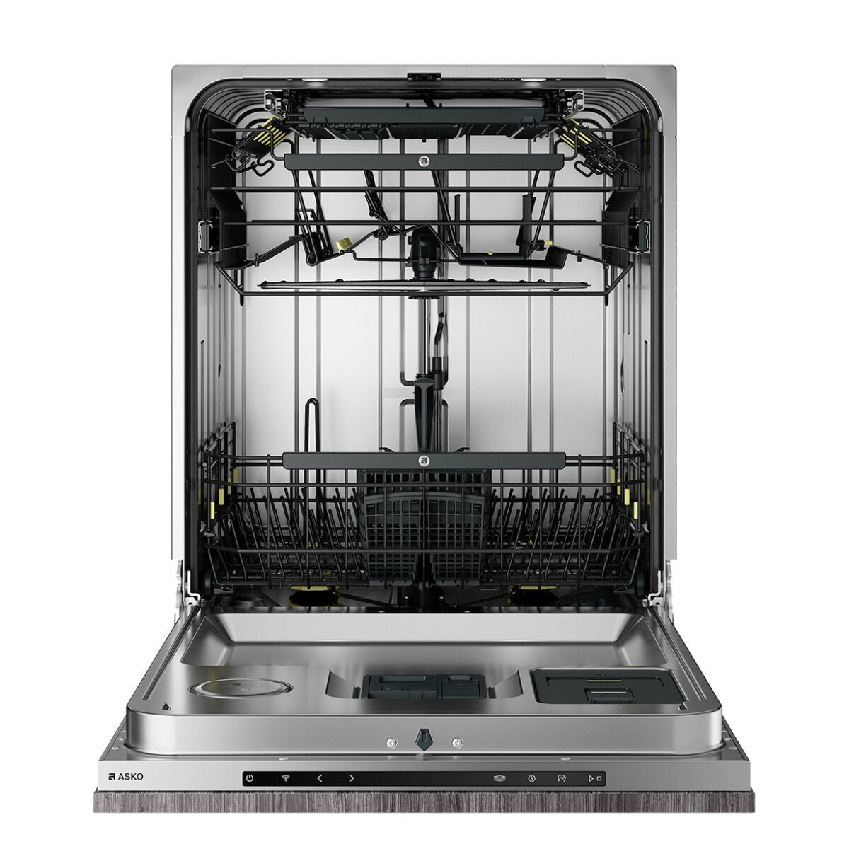 Zmywarka ASKO DFI747U/1 do zabudowy w rozmiarze XL oferuje imponującą pojemność na 14 kompletów naczyń, co czyni ją doskonałym wyborem dla większych gospodarstw domowych. Ciesz się cichą pracą urządzenia na poziomie zaledwie 38 dB. Intuicyjny wyświetlacz TFT zapewnia łatwą obsługę 15 dostępnych programów zmywania. Zaawansowany system natrysku 9 Spray™ gwarantuje dokładne i efektywne mycie naczyń na wszystkich poziomach, w 3 praktycznych koszach. Komfort użytkowania podnosi funkcja automatycznego otwierania drzwi po zakończonym cyklu, co wspomaga naturalne suszenie. Innowacyjny system suszenia Turbo Combi Drying™ z czujnikiem optymalizuje proces suszenia, zapewniając idealnie suche naczynia. Wskaźnik Status Light™ z zegarem informuje o aktualnym statusie pracy urządzenia. Bezpieczeństwo użytkowania gwarantuje zaawansowany system Aqua Safe™. Dodatkowo, zmywarka oferuje nowoczesne rozwiązania takie jak łączność Wi-Fi, system otwierania Push-to-open, jasne oświetlenie wnętrza z 2 diodami LED, automatyczne dozowanie detergentu dzięki funkcji Auto Dose oraz higieniczne czyszczenie światłem UV.
