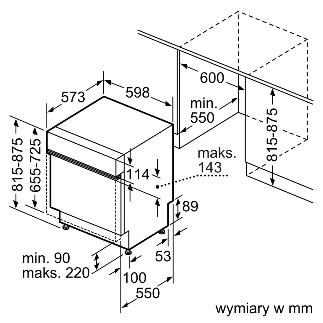 Wymagana przestrzeń instalacyjna (WxSxG) 815-875 x 600 x 550 mm