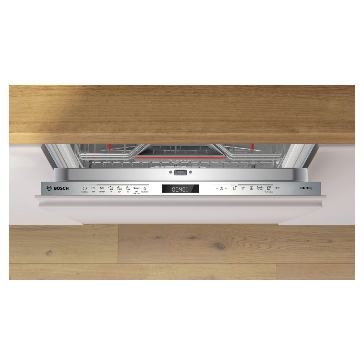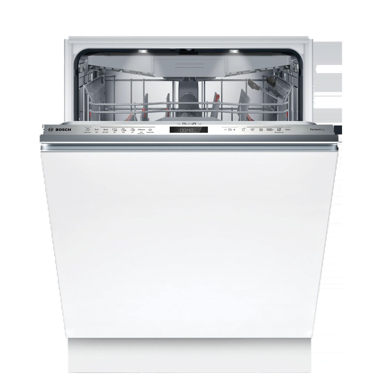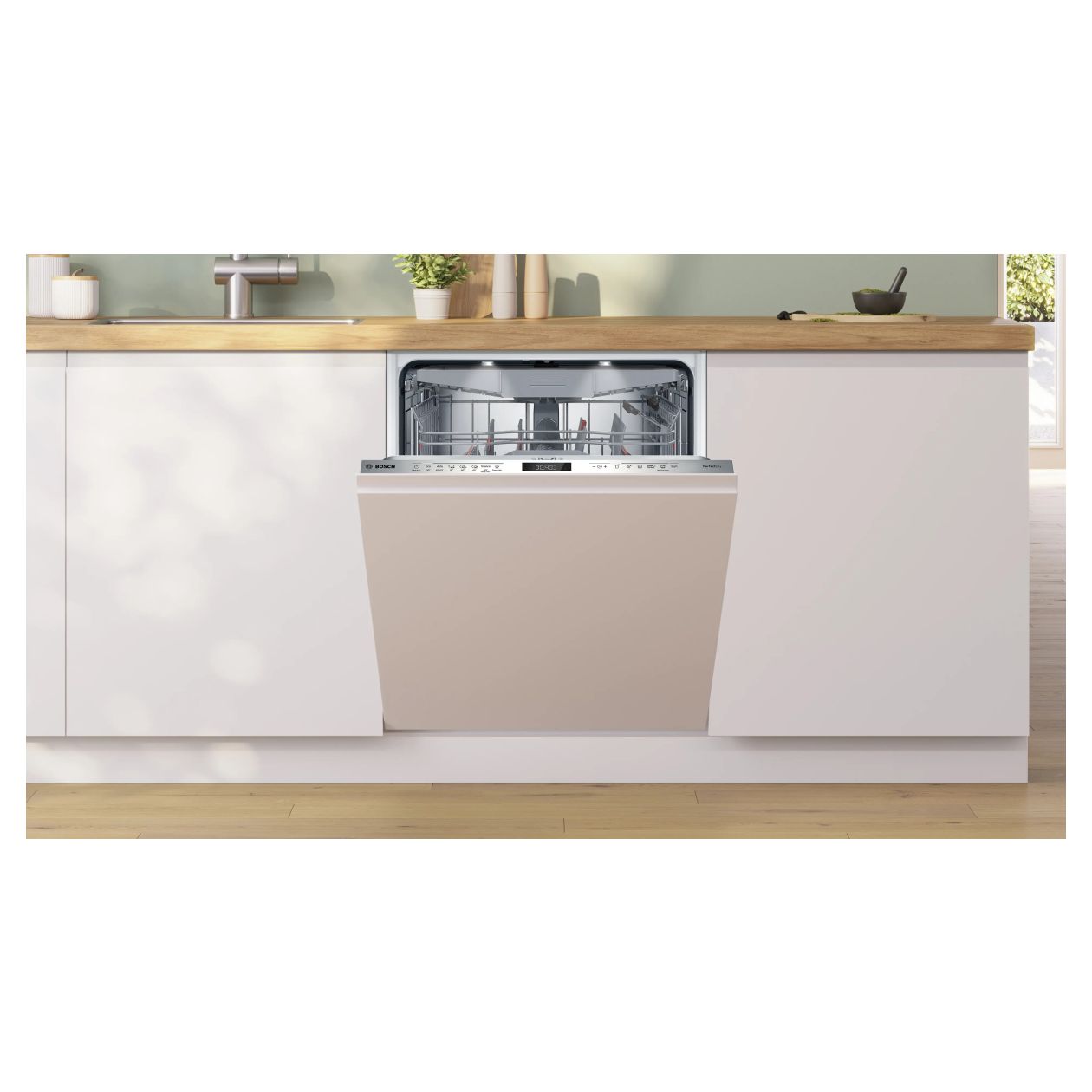 W pełni zintegrowana Zmywarka Bosch Serie 6 SMV6ZCX25E o szerokości 60 cm została zaprojektowana z myślą o dyskretnej zabudowie, pozwalającej na idealne zlicowanie urządzenia z frontami meblowymi. Dzięki standardowym wymiarom urządzenia 815x598x550 mm oraz możliwości regulacji cokołu w pionie i poziomie, model ten łatwo adaptuje się do zróżnicowanych projektów kuchennych, w tym również w instalacji kolumnowej. Brak dominującego koloru produktu na froncie sprawia, że urządzenie pozostaje całkowicie niewidoczne, zachowując spójność estetyczną wnętrza.