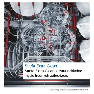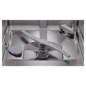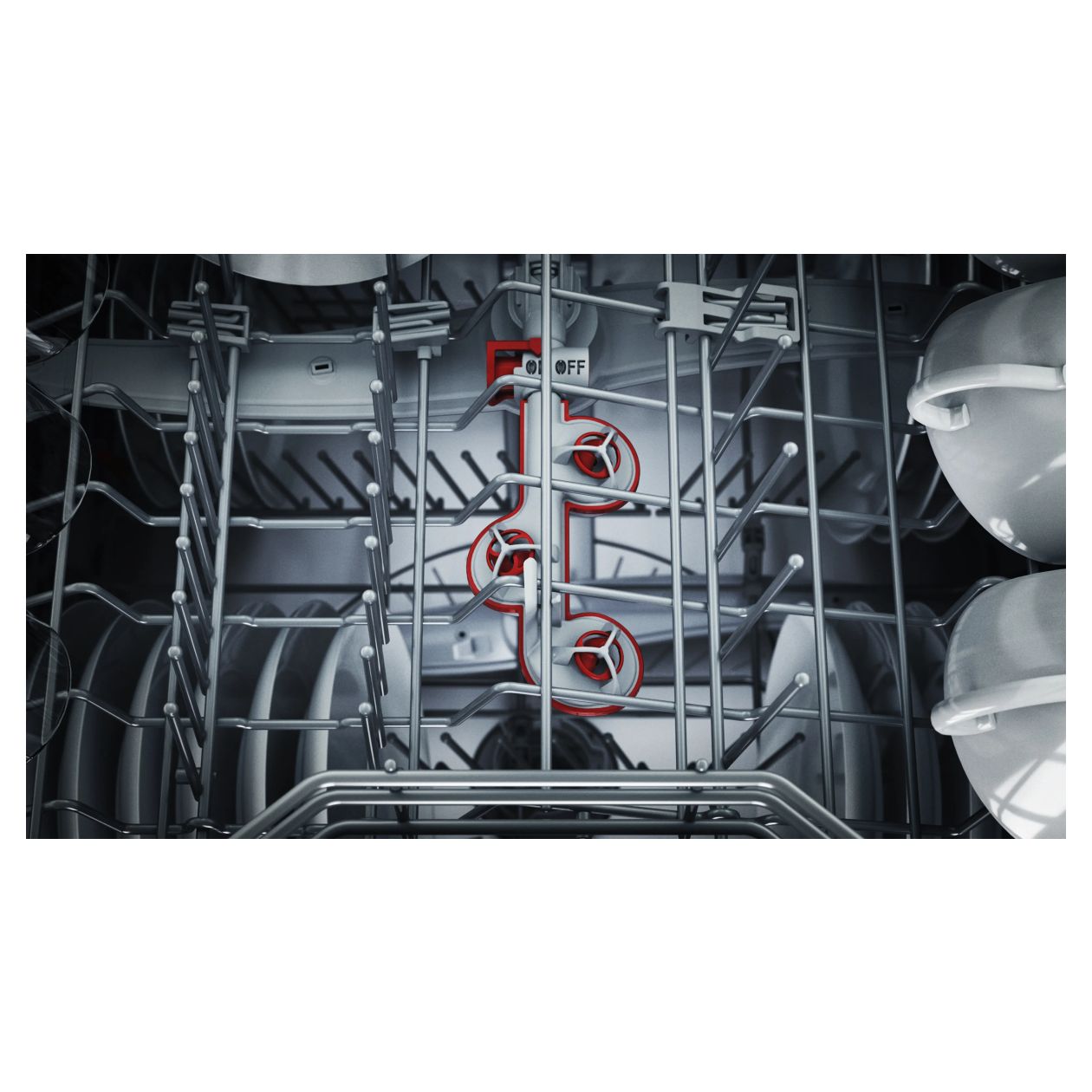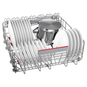 System zabezpieczający przed zalaniem: AquaStop odcina dopływ wody bezpośrednio przy kranie w razie wykrycia nieszczelności, zapobiegając uszkodzeniom mienia. Regulacja wysokości górnego kosza Rackmatic 3-stopniowy pozwala na zmianę położenia kosza nawet przy pełnym załadowaniu, co ułatwia mycie wysokich garnków w dolnej sekcji. Funkcja SpeedPerfect Plus skraca czas trwania wybranego programu przy zachowaniu pełnej skuteczności zmywania, a Strefa Intensywna zwiększa ciśnienie natrysku w dolnym koszu, usuwając przypalenia z naczyń kuchennych.