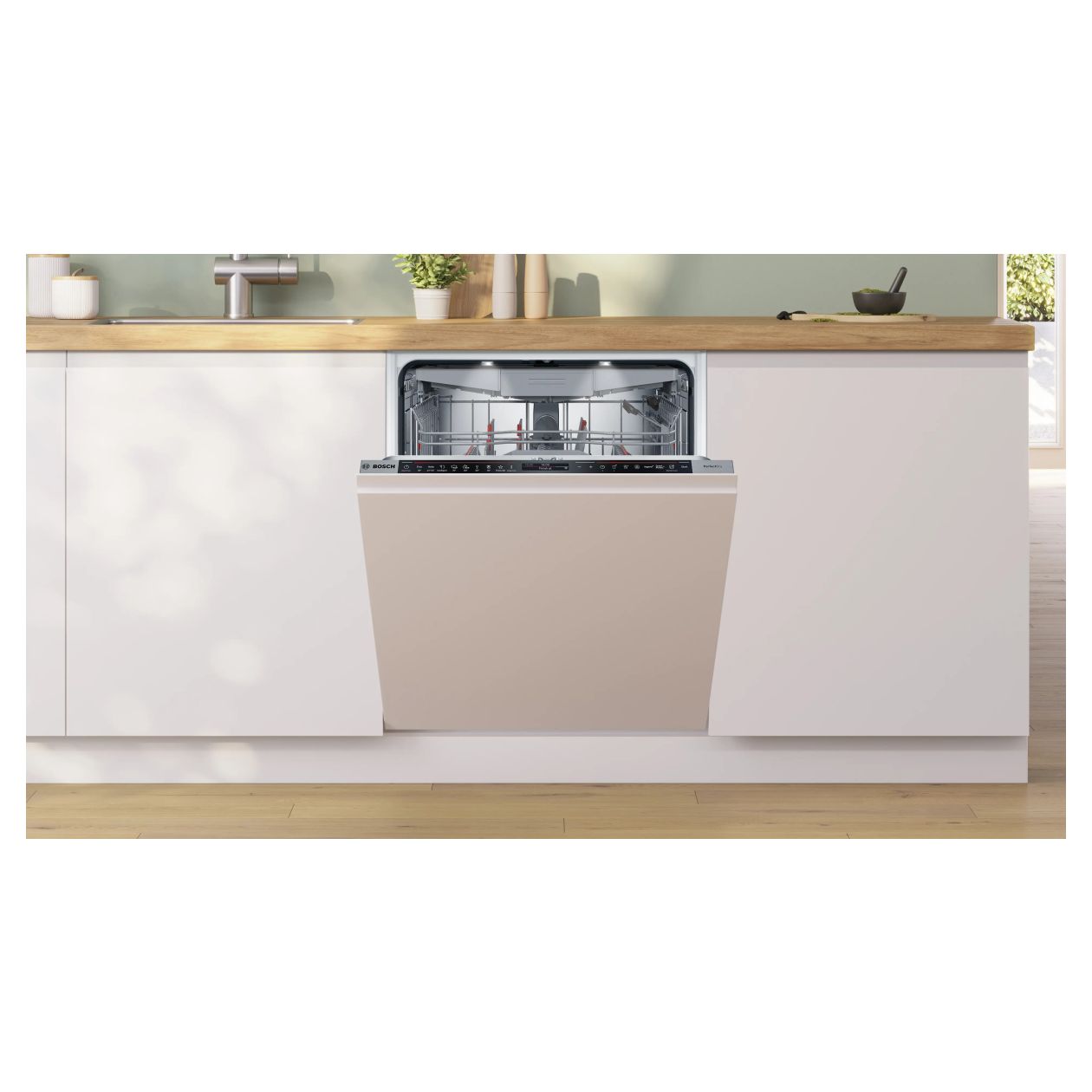 W pełni zintegrowana Zmywarka Serie 8 SMD8TCX04E to urządzenie zaprojektowane z myślą o całkowitej dyskrecji w kuchennej zabudowie. Dzięki wymiarom urządzenia 815x598x550 mm oraz systemowi OpenAssist, front meblowy otwiera się po lekkim naciśnięciu, co pozwala na rezygnację z zewnętrznych uchwytów i zachowanie czystej linii mebli. Precyzyjne zlicowanie z sąsiednimi szafkami ułatwia pionowa i pozioma regulacja cokołu, sprawiając, że sprzęt staje się integralną częścią wnętrza.