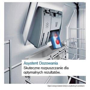 Technologia PerfectDry - Zeolith wykorzystuje naturalny minerał do pochłaniania wilgoci i przekształcania jej w ciepło, co w połączeniu z funkcją EfficientDry i wymiennikiem ciepła przyspiesza proces suszenia. Bezpieczeństwo instalacji zapewnia system zabezpieczający przed zalaniem AquaStop, który odcina dopływ wody w przypadku wykrycia nieszczelności. Program czyszczenia zmywarki MachineCare usuwa osady z komory, utrzymując higienę urządzenia przy minimalnym nakładzie pracy.