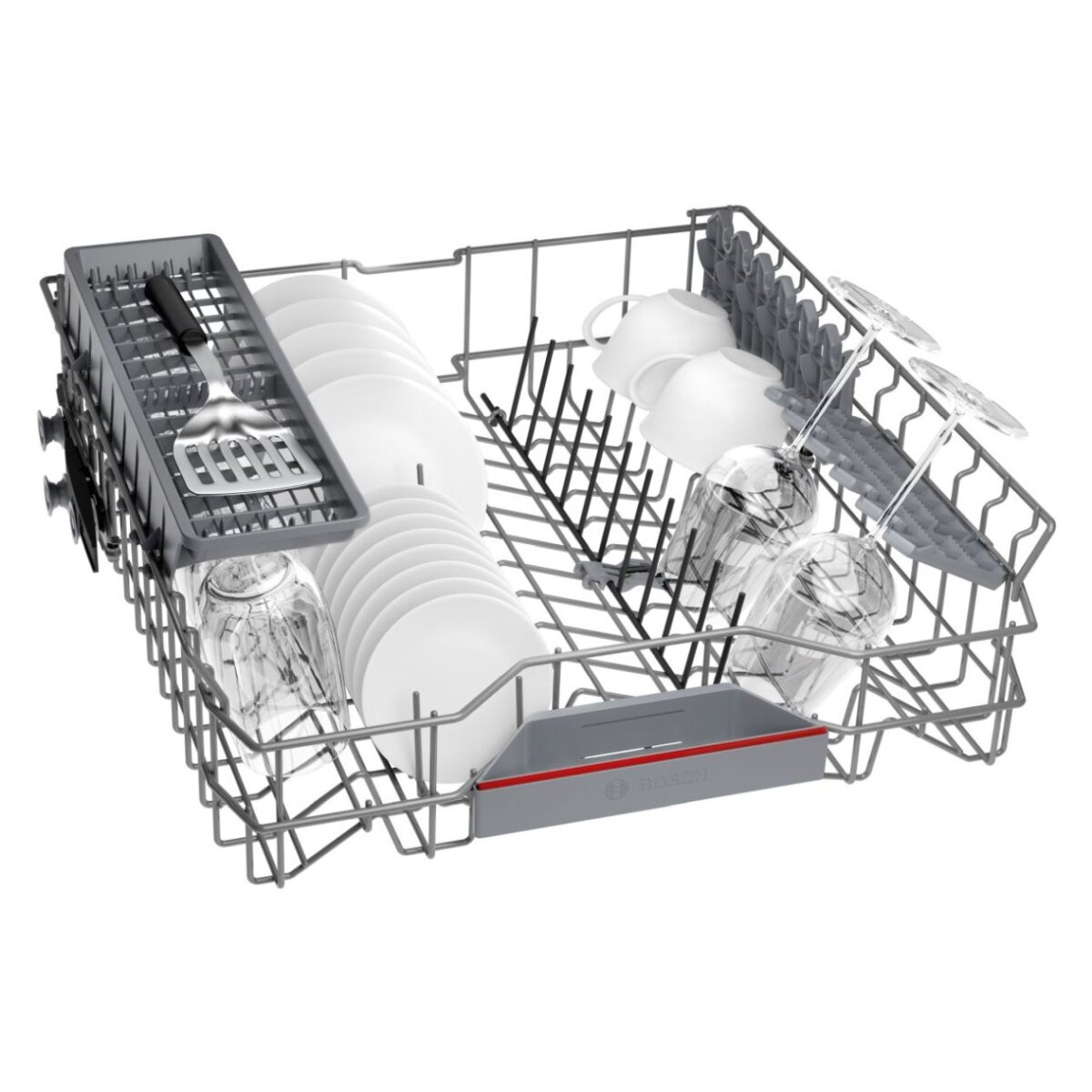 Zmywarka z łącznością Home Connect (Wi-Fi), funkcją ExtraDry i trybem Silence Plus (42 dB). Programy: Eco 50°C, Auto 45–65°C, Garnki 70°C, Godzinny 65°C, Cichy 50°C, Favourite (fabrycznie: mycie wstępne). Funkcje dodatkowe: zdalny start, HalfLoad, SpeedPerfect Plus; w aplikacji: Higiena Plus, Silence on demand. System koszy Flex z rackMatic (3 poziomy), płynnym wysuwem dolnego kosza i RackStopper. Technologie: wymiennik ciepła, AquaSensor, Asystent Dozowania, EcoSilence Drive, 3-częściowy filtr; wnętrze ze stali szlachetnej.