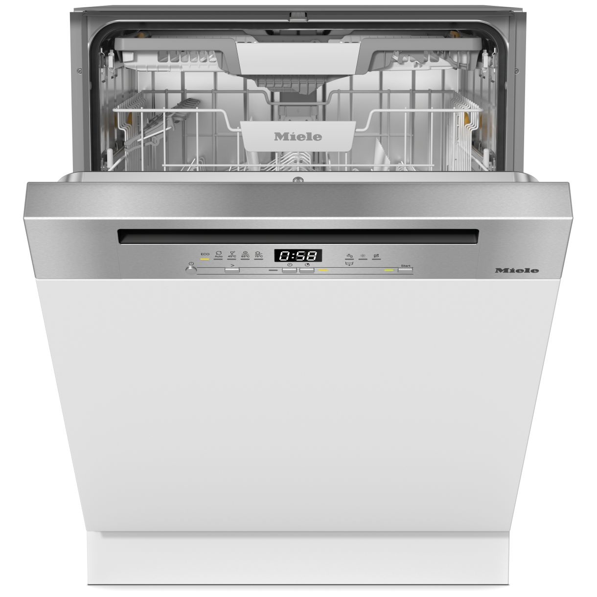 Zmywarka G 5811 SCi Active Plus (SKU: 12870330) ma panel w kolorze Stal szlachetna/CleanSteel z przyciskami wyboru programu. 3-wierszowy wyświetlacz 7-segmentowy w kolorze białym pokazuje pozostały czas cyklu oraz tryb pracy. Możliwe jest programowanie startu z opóźnieniem do 24 godzin. System AutoClose delikatnie domyka drzwiczki.
