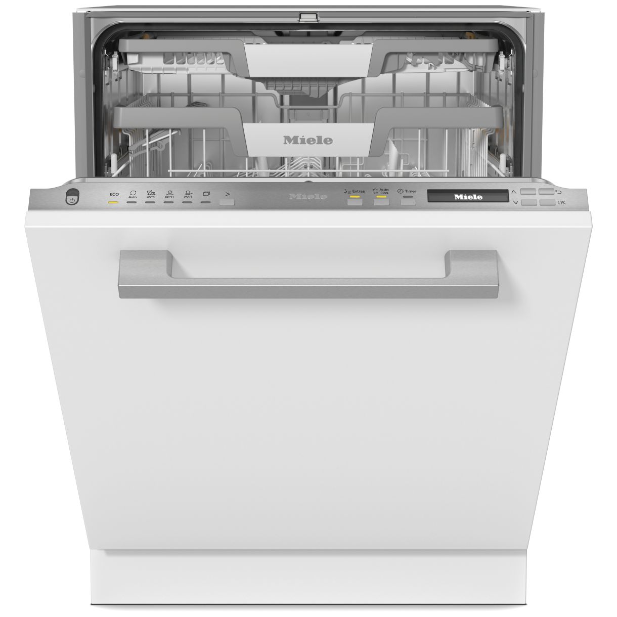 W pełni zintegrowana zmywarka do naczyń G 7082 SCVi AutoDos Stal szlachetna (12870500) wykorzystuje automatyczne dozowanie z PowerDisk eliminując ręczne dodawanie detergentu. Połączenie sieciowe z Miele@home umożliwia zdalne sterowanie i monitoring. 1-wierszowy wyświetlacz tekstowy z opcją MultiLingua pokazuje czas pozostały oraz opóźnienie startu do 24 godzin. EcoFeedback monitoruje i wyświetla przewidywane zużycie wody i energii.