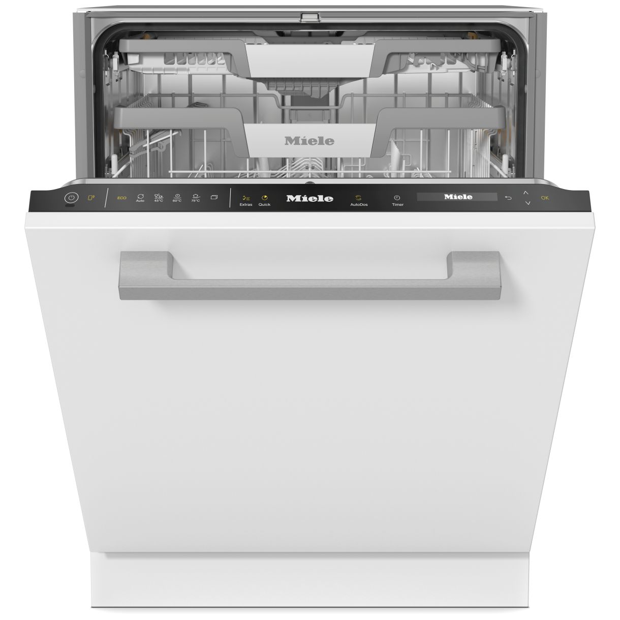 Zmywarka Miele G 7651 SCVi AutoDos ObsidianBlack model 12906880 integruje szereg technologii dla efektywnego zmywania. Interfejs z urządzeniem odbywa się poprzez w pełni zintegrowany panel z panelem dotykowym i 1-wierszowym wyświetlaczem tekstowym w kolorze białym który obsługuje MultiLingua. Połączenie sieciowe z Miele@home umożliwia zdalne sterowanie i monitorowanie urządzenia. Automatyczne dozowanie z PowerDisk precyzyjnie uwalnia detergent w odpowiednim momencie cyklu co eliminuje ręczne uzupełnianie. Funkcje takie jak wskazanie czasu pozostałego programowanie startu z opóźnieniem do 24 godzin oraz element wskazujący trybu roboczego wizualnie i akustycznie z regulacją głośności wspierają zarządzanie czasem i pracą urządzenia. EcoFeedback informuje o zużyciu energii i wody co pozwala na optymalizację.
