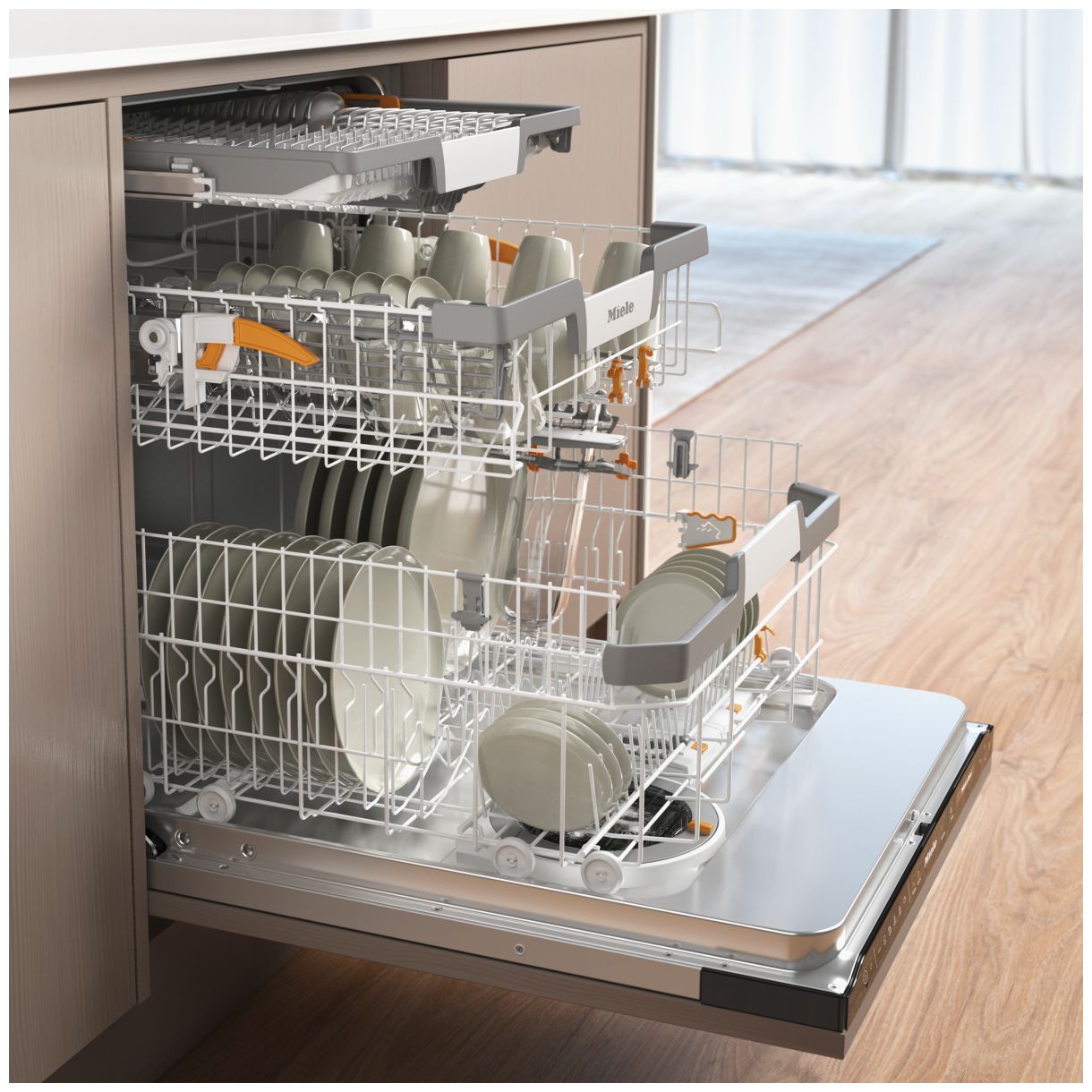 Urządzenie oferuje komfortowe zarządzanie codziennym zmywaniem dla 14 zestawów naczyń. Wnętrze zmywarki zaprojektowano z myślą o funkcjonalności wyposażając ją w szufladę 3D MultiFlex do sztućców 2 uchwyty na szkło FlexCare oraz 1 półeczkę na filiżanki FlexCare co ułatwia aranżację. Zaawansowana metoda czyszczenia AutoDos z PowerDisk precyzyjnie dozuje detergent natomiast płukanie świeżą wodą i suszenie AutoOpen zapewniają naczynia wolne od zacieków. Dodatkowo potwierdzona higieniczność usuwa ponad 999% wirusów dbając o czystość. Aktywne suszenie kondensacyjne dopełnia proces zapewniając gotowość naczyń do natychmiastowego użycia.