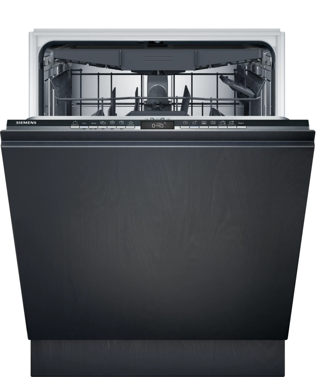 To jest zmywarka do pełnej zabudowy firmy Siemens z czarnym kolorowym wyświetlaczem. Ma regulację cokołu, klasę efektywności energetycznej D. Zużywa 0,849 kWh energii i 9,5 litrów wody na cykl programu Eco. Czas trwania programu Eco wynosi 4 godziny i 55 minut, a pobór energii na 100 cykli programu Eco to 85 kWh. Zmywarka może pomieścić maksymalnie 14 talerzy i ma różne programy, w tym Auto 45-65°C, Eco, Favourite, garnki, Godzinny, szybki 45°C.
